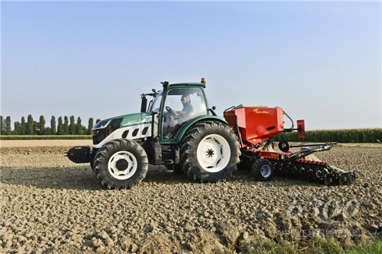 配备马特马克播种机进行田间测试的雷沃阿波斯拖拉机