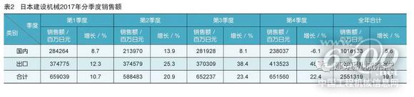 日本建设机械的国内销售额2017年第1季度为2843亿日元,同比增长8.7%;第2季度为2140亿日元,同比增长13.9%;第3季度为2819亿日元,同比增长8.1%;第4季度为2380亿日元,同比减少6.1%。日本建设机械的国内销售额2017年全年为10181亿日元,比2016年的9637亿日元增长5.6%。