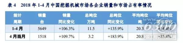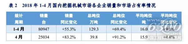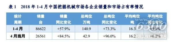 根据中国工程机械工业协会挖掘机械分会统计数据,2018年1-4月纳入分会统计的25家主机制造企业销售情况如表1所示。1-4月销量同比涨幅超过50%,市场持续高增长。平均吨位大幅提高,说明中、大挖市场占比持续提升。2018年1-4月销量接近2011年历史极值,创造历史同期第二高销量。
