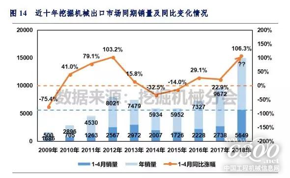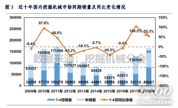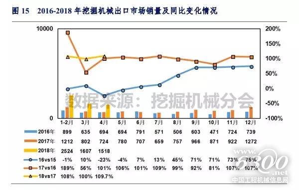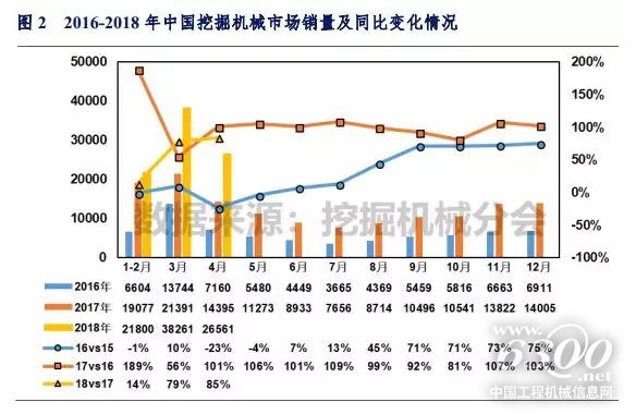 中国挖掘机械市场自2016年下半年进入高速增长通道,9月至12月连续四个月涨幅超过70%,2017年增长势头更加强劲,全年销量接近翻番增长。进入2018年以来,在高基数基础上,行业保持稳健高速增长态势。