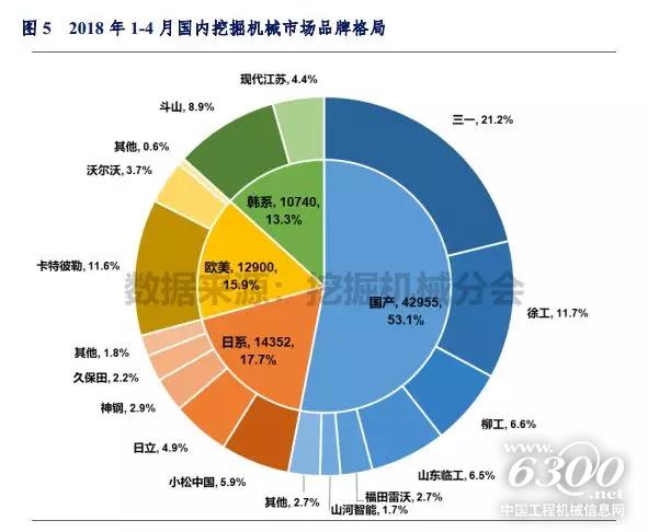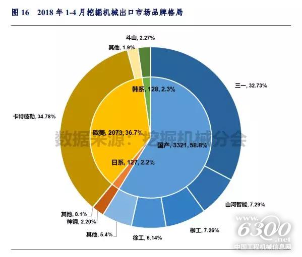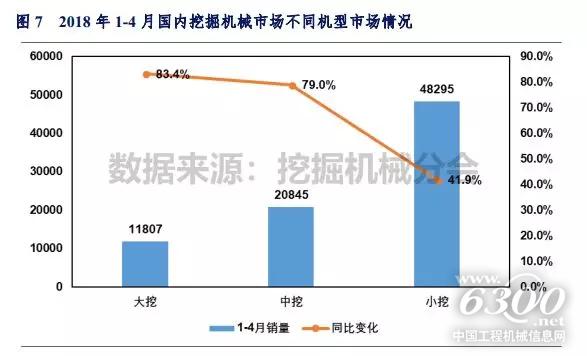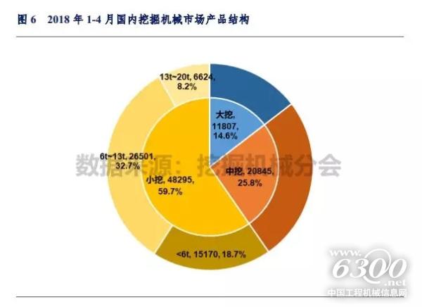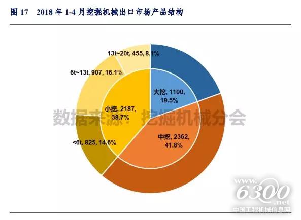 2018年1-4月大挖、中挖、小挖销量分别为1100、2362和2187台,市场份额分别为19.5%、41.8%和38.7%。其中6吨以下迷你挖销量和6~13吨小挖销量分别为825和907台,市场份额分别为14.6%和16.1%。
