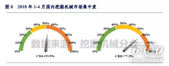 2018年1-4月国内挖掘机械市场集中度CR4=53.5,CR8=77.3,相比3月市场集中度有所上升(前值CR4=52.5,CR8=77.0)。其中,大挖、中挖、小挖CR4市场集中度分别为57.3%、51.8%和53.9%,CR8市场集中度分别为81.9%、77.7%和77.6%。