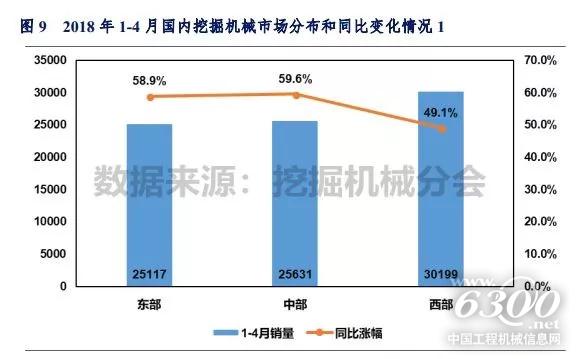 2018年1-4月东部、中部、西部地区挖掘机械销量分别25117、25631和30199台,同比涨幅分别58.9%、59.6%和49.1%。