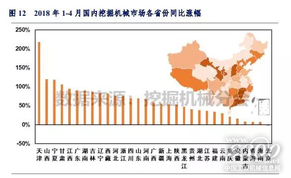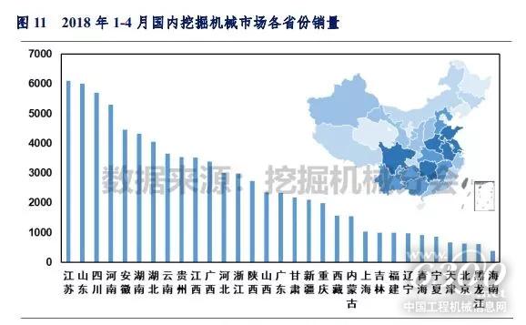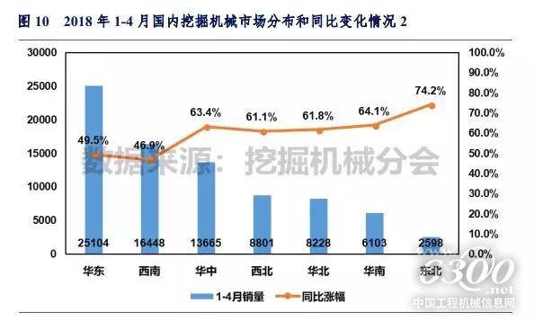 2018年1-4月华东、西南、华中、西北、华北、华南和东北地区挖掘机械销量分别25104、16448、13665、8801、8228、6103和2598台,同比涨幅分别49.5%、46.9%、63.4%、61.1%、61.8%、64.1%和74.2%。