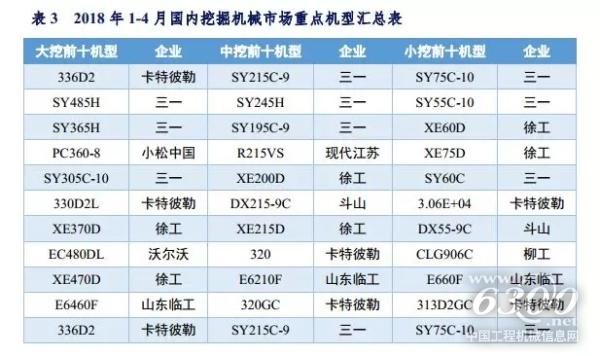 2018年1-4月,国内不同规格挖掘机械销量前十机型如下表所示。大挖市场主要被卡特彼勒、三一垄断,国内品牌在小挖市场的竞争力更强。