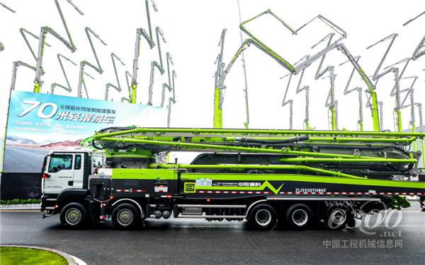 ▲全球最长臂架新能源泵车——中联重科70米轻混泵车