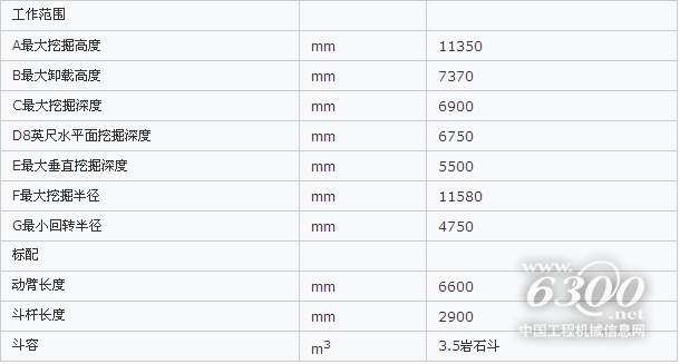 选配:可根据用户的需求,配置其他作业装置,如:长动臂、长斗杆、深挖斗、抓料斗、破碎锤、液压剪等等;挖斗标配3.5岩石斗,选配3.1岩石斗。